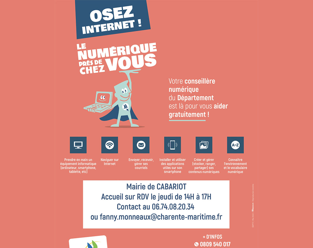 Une conseillère numérique vous accueille sur rendez-vous pour un accompagnement numérique (prise en main d’un équipement informatique, gestion de mails, apprentissage du vocabulaire informatique…) Pour vous ou un de vos proches, n’hésitez pas à contacter Fanny MONNEAUX.